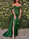 Emerald Green Satin Side Slit Long Evening Prom Dresses, Off Shoulder Prom Dress, MR9620