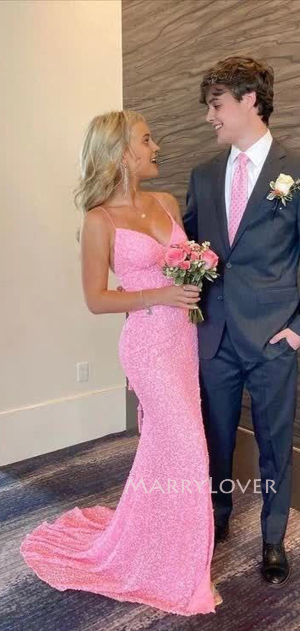 Gorgeous Spaghetti Straps Pink Sequins Long Evening Prom Dresses, V-neck Mermaid Prom Dress, MR9628