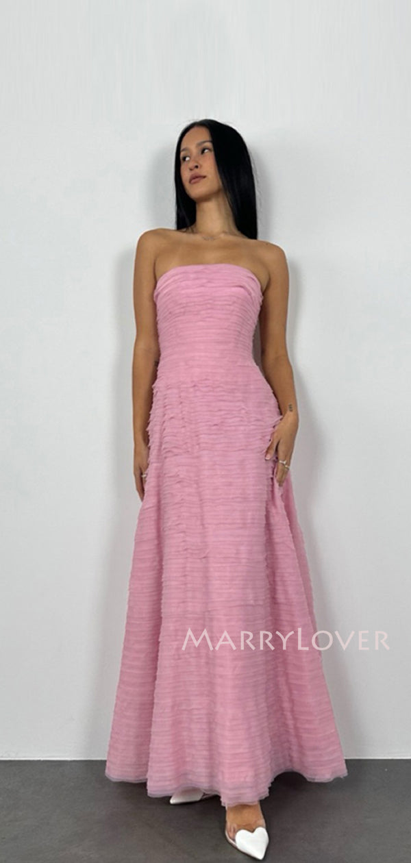 Morden Pink Tulle Long Evening Prom Dresses, Strapless Prom Dress, MR9797