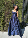 Navy Blue Satin A-line Straps Long Evening Prom Dresses, MR0032