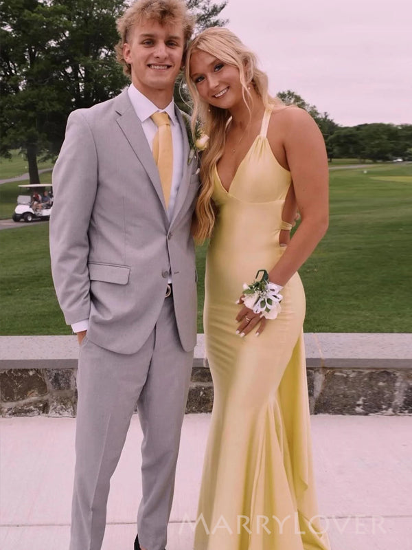 Sexy Backless V-neck Yellow Long Evening Prom Dresses, MR9661