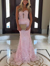 Sweetheart Pink Lace Appliques Long Evening Prom Dresses, Mermaid Prom