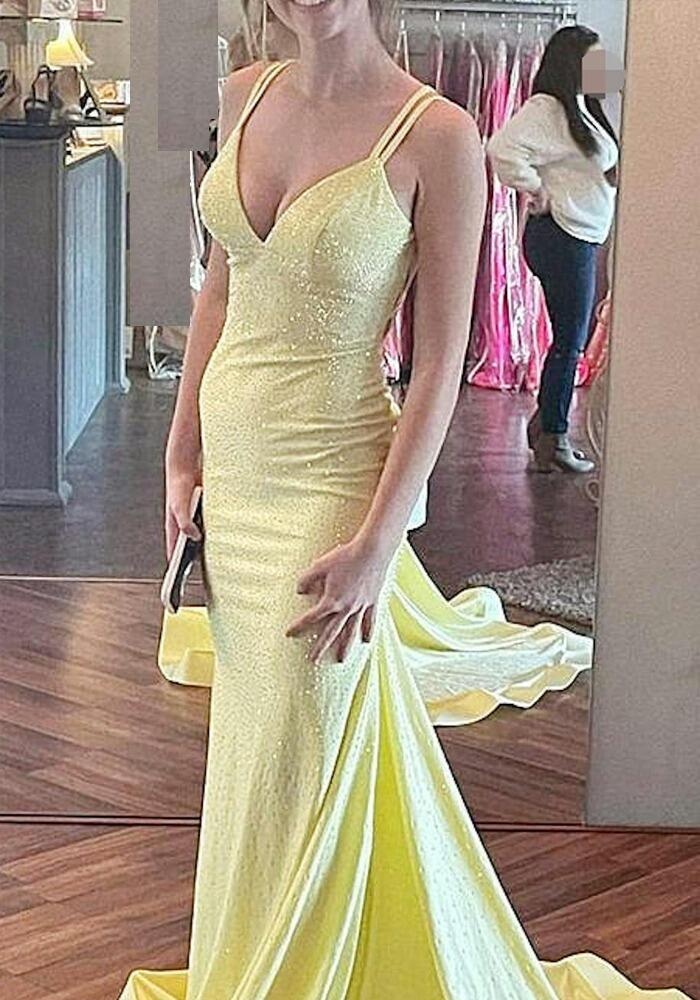Yellow Backless Mermaid Sparkly V-neck Long Evening Prom Dresses, MR9220 Yellow Backless Mermaid Sparkly V-neck Long Evening Prom Dresses, MR9220