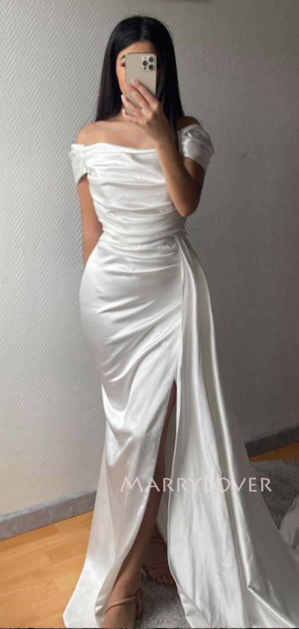White Satin Mermaid Long Evening Prom Dresses, Off Shoulder Wedding dress, MR9462