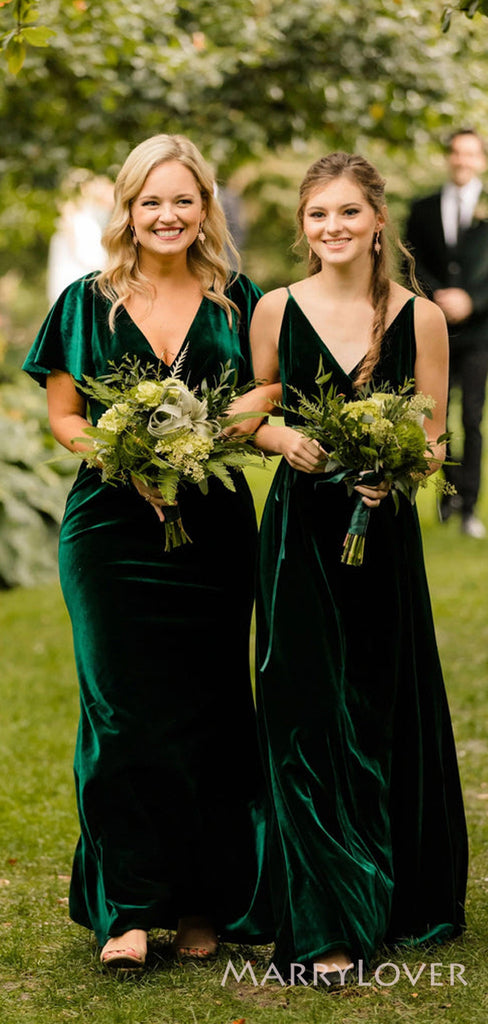 Mismatched Dark Green Velvet Deep V-neck Long Custom Bridesmaid Dresses , BN1191