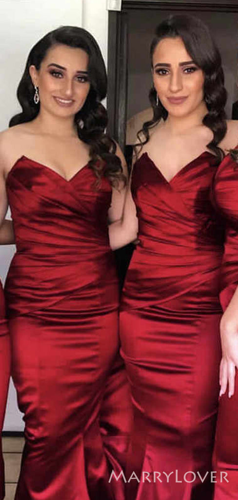 Strapless Red Satin Mermaid Long Bridesmaid Dresses , BN1029 Strapless Red Satin Mermaid Long Bridesmaid Dresses , BN1029