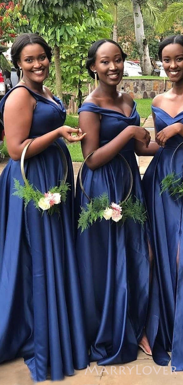 Off Shoulder Satin A-line Long Side Slit Custom Bridesmaid Dresses , B
