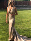 Champagne Gold Mermaid V Neck Lace Long Evening Prom Dresses, MR7228