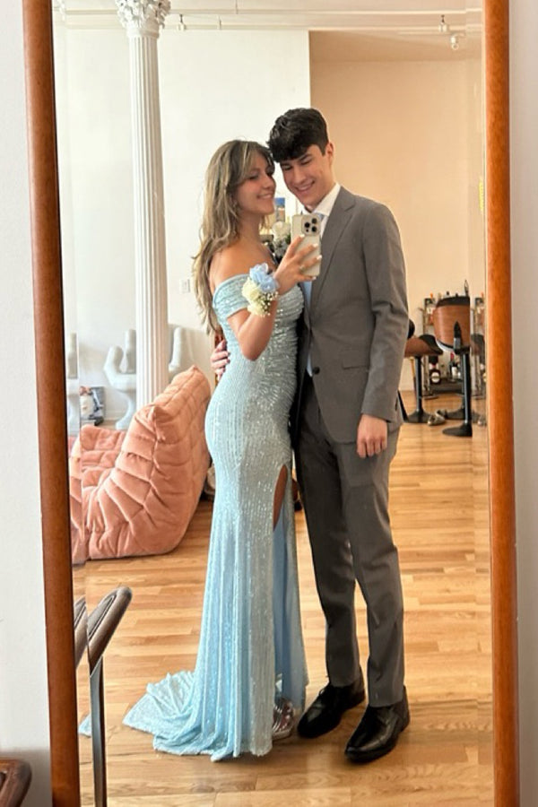 Elegant Blue Squins Mermaid Side Slit Long Evening Prom Dresses, Off Shoulder Prom Dress, MR0251