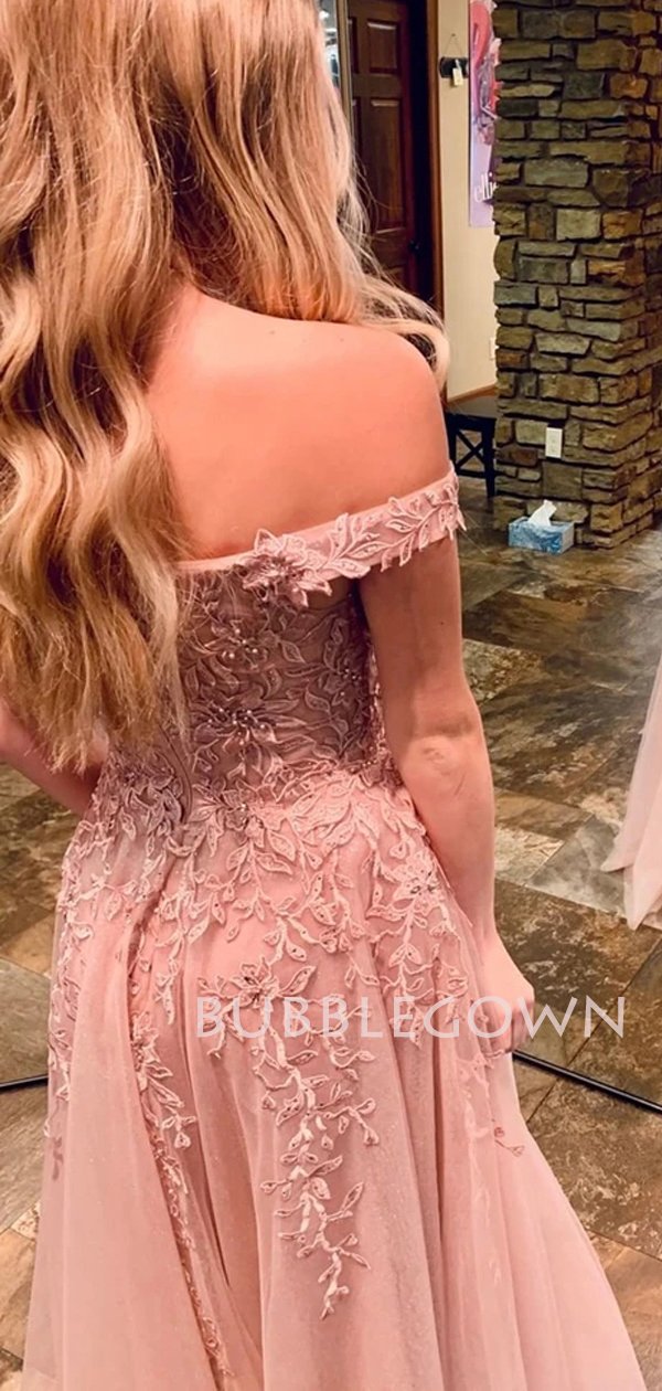 Off Shoulder Tulle Floor Length Dusty Pink Lace A-line Long Evening Pr