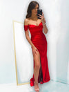 Simple Off Shoulder Red Satin Long Evening Prom Dresses, Custom Side Slit Prom Dress, MR8541
