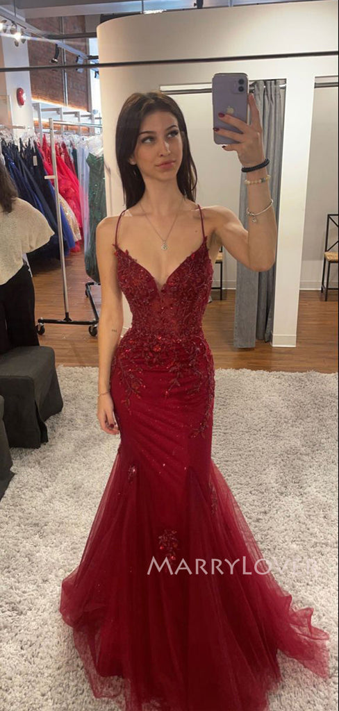 Elegant Burgundy Tulle Appliques V-neck Long Evening Prom Dresses, Mermaid Prom Dress, MR9410 Elegant Burgundy Tulle Appliques V-neck Long Evening Prom Dresses, Mermaid Prom Dress, MR9410