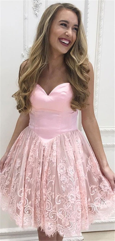 Newest Sweetheart Strapless Lace Short Pink Homecoming Dresses, HD0529 Newest Sweetheart Strapless Lace Short Pink Homecoming Dresses, HD0529