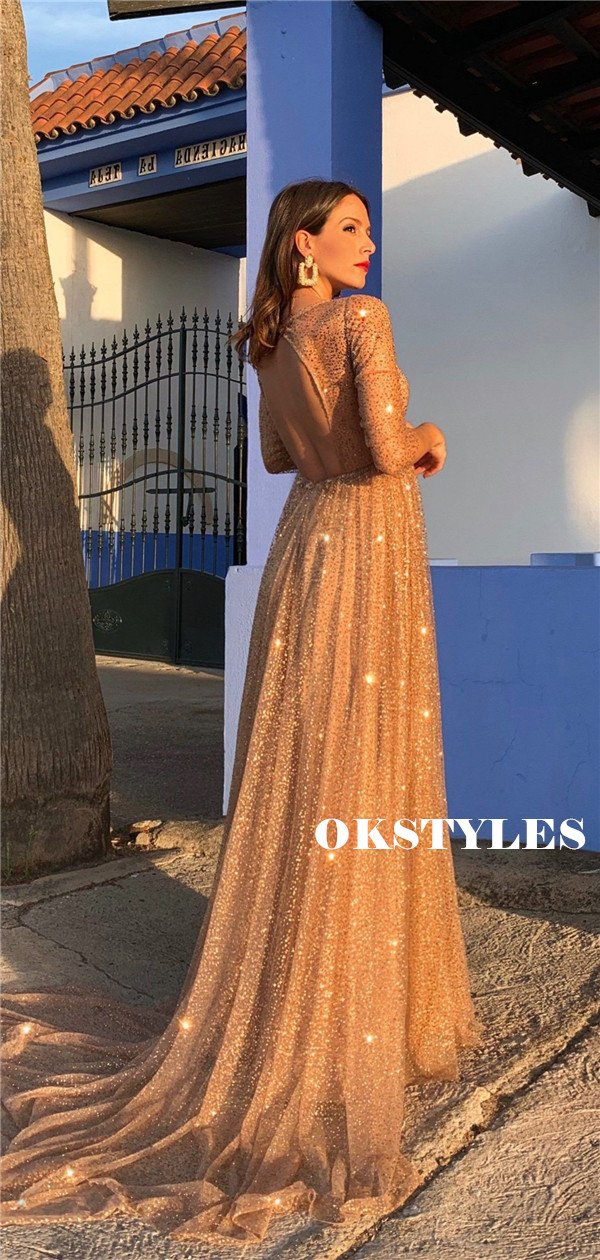 Sparkly A-line V-neck 3/4 Sleeves Open-back Long Prom Dresses, PD0653 Sparkly A-line V-neck 3/4 Sleeves Open-back Long Prom Dresses, PD0653